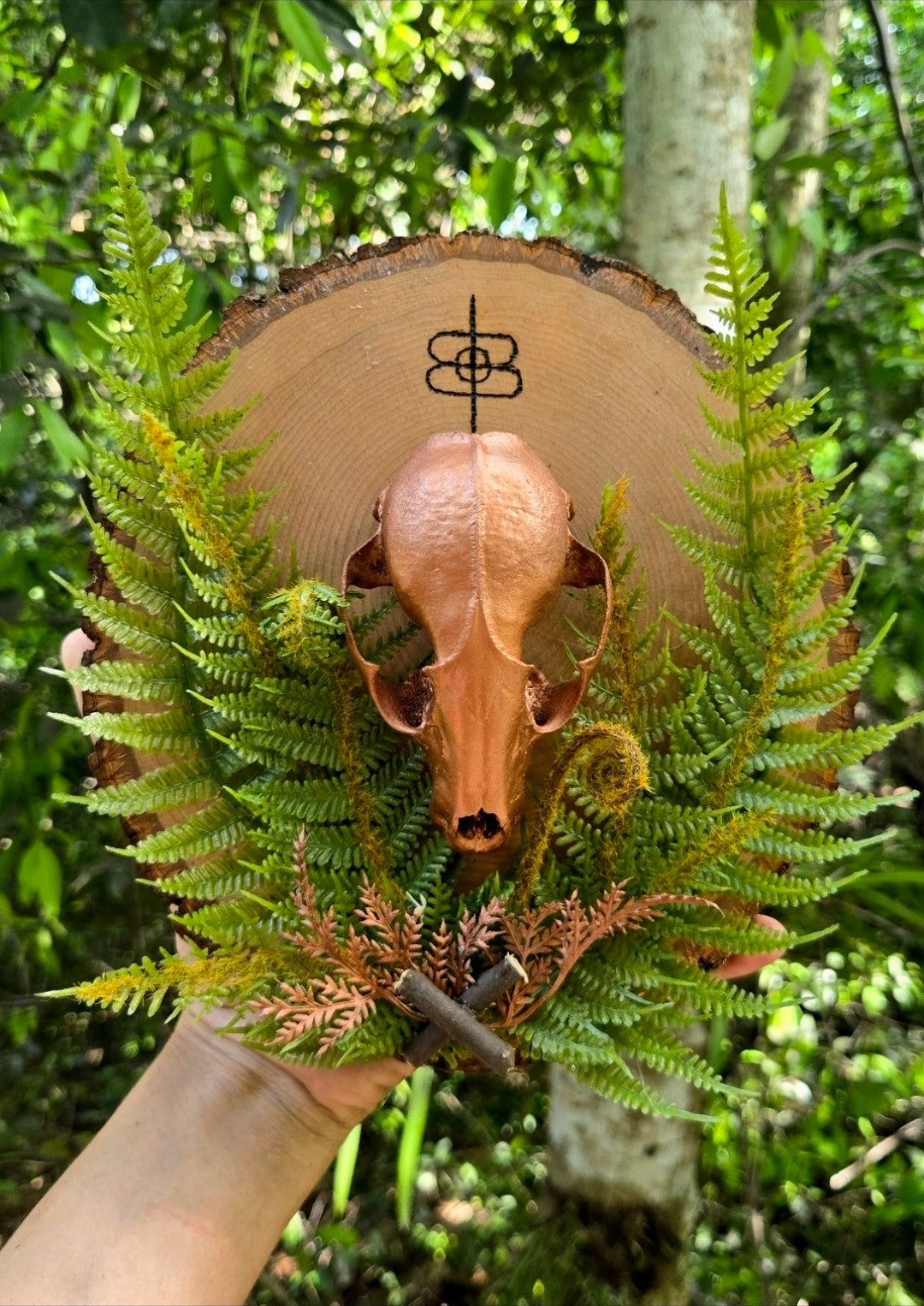 Original art piece created using a painted raccoon skull (field collected from the forest floor, no hunting/euthanasia involved), and everlasting-ferns (they're plastic š) mounted on a stained stump sliver. Also details a woodburnt baronofbile signature and a bracket for wall hanging! 20% of all sales go towards wildlife conservation efforts šæ